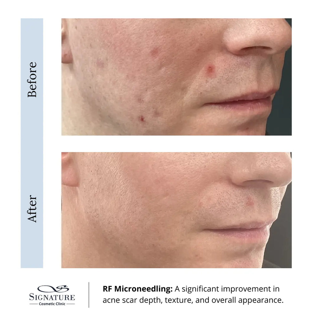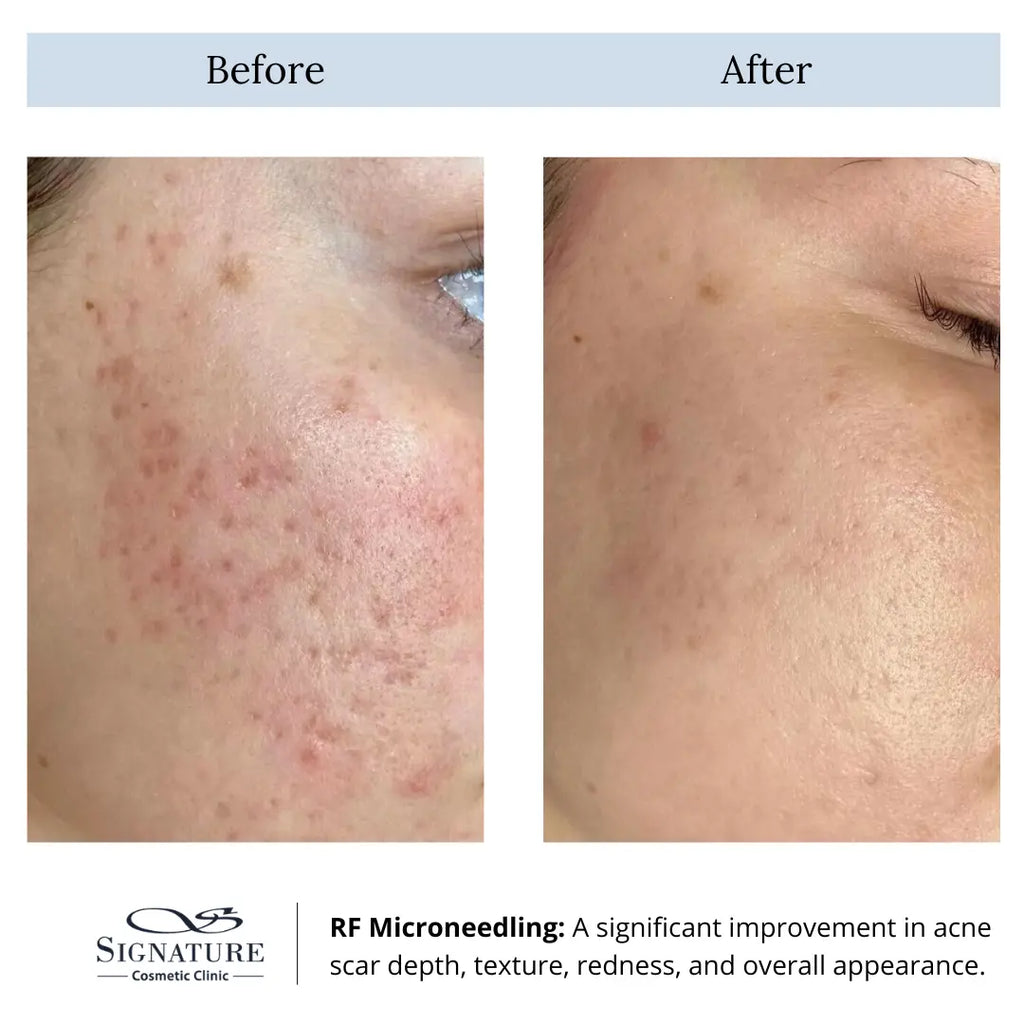 One of the most highly effective uses of Potenza RF microneedling is in the reduction of acne scars and other types of scarring. By breaking down old collagen and stimulating the production of new, healthy tissue, RF microneedling smooths and refines the skin’s texture from within. It also: